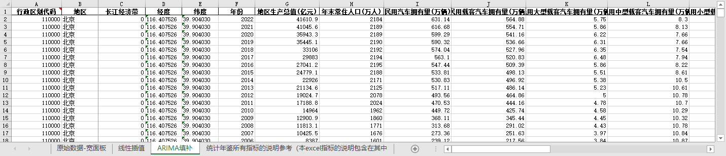 excel数据文件包原始数据-宽面板(由于多年度指标不同存在缺失值)、线性插值、ARIMA填补三个版本,提供您参考使用。