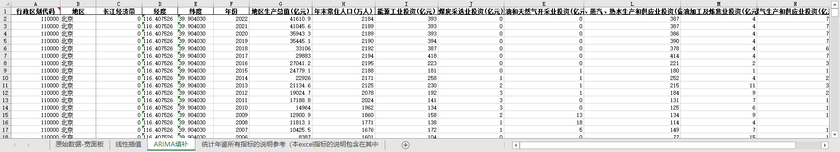 excel数据文件包原始数据-宽面板(由于多年度指标不同存在缺失值)、线性插值、ARIMA填补三个版本,提供您参考使用。