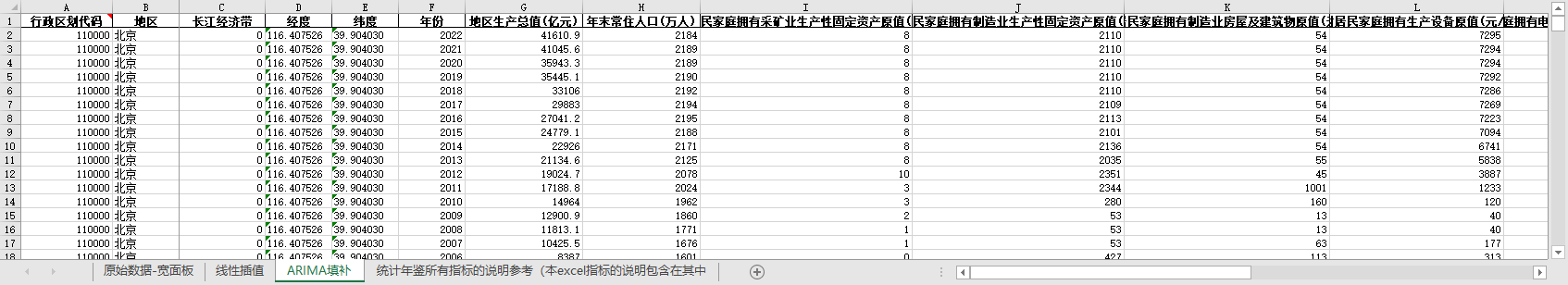 excel数据文件包原始数据-宽面板(由于多年度指标不同存在缺失值)、线性插值、ARIMA填补三个版本,提供您参考使用。