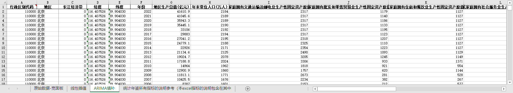 excel数据文件包原始数据-宽面板(由于多年度指标不同存在缺失值)、线性插值、ARIMA填补三个版本,提供您参考使用。
