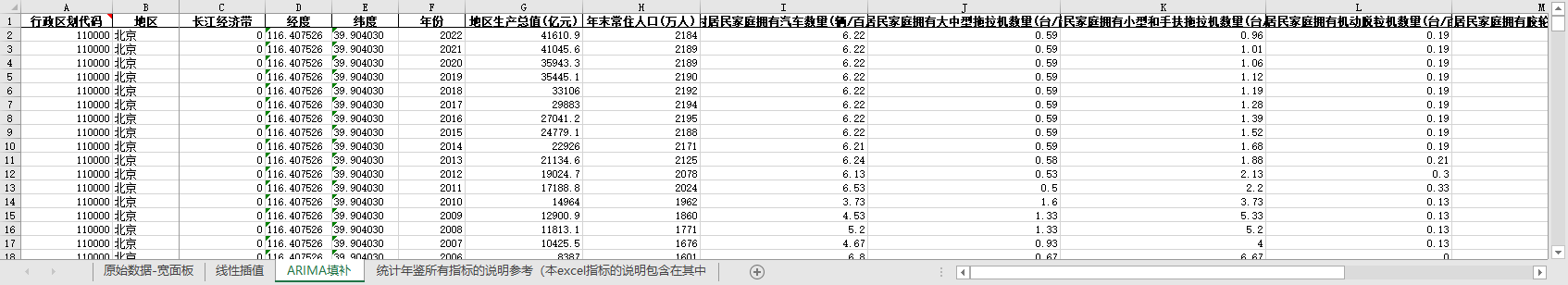 excel数据文件包原始数据-宽面板(由于多年度指标不同存在缺失值)、线性插值、ARIMA填补三个版本,提供您参考使用。