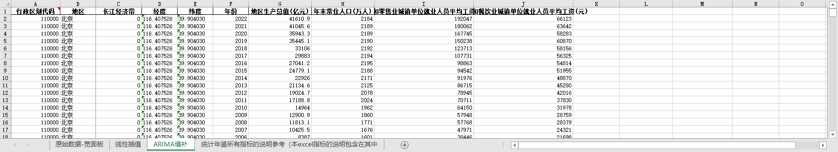 excel数据文件包原始数据-宽面板(由于多年度指标不同存在缺失值)、线性插值、ARIMA填补三个版本,提供您参考使用。