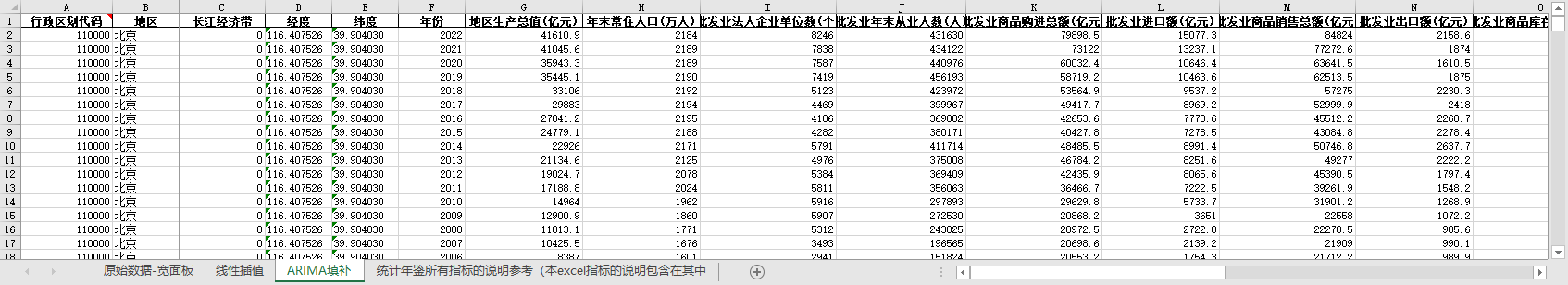 excel数据文件包原始数据-宽面板(由于多年度指标不同存在缺失值)、线性插值、ARIMA填补三个版本,提供您参考使用。