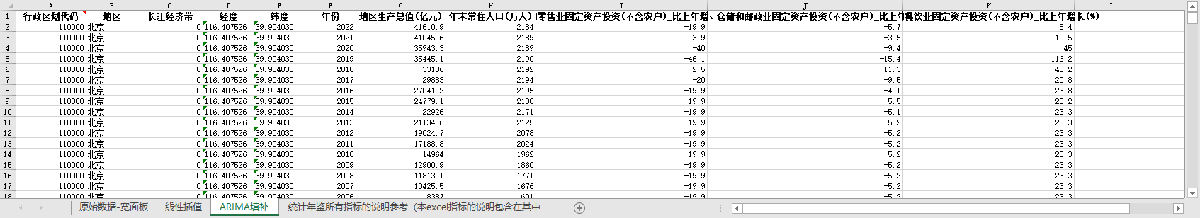 excel数据文件包原始数据-宽面板(由于多年度指标不同存在缺失值)、线性插值、ARIMA填补三个版本,提供您参考使用。