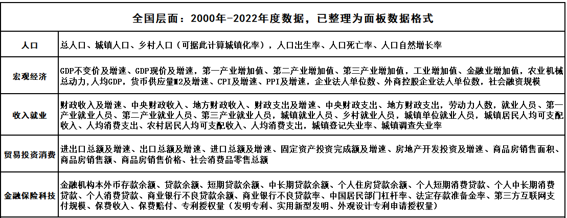 2000-2022 全国层面:总人口、城镇人口、乡村人口(可据此计算城镇化率),人口出生率、人口死亡率、人口自然增长率GDP不变价及增速、GDP现价及增速,第一产业增加值、第二产业增加值、第三产业增加值,工业增加值、金融业增加值,农业机械总动力,人均GDP,货币供应量M2及增速、CPI及增速、PPI及增速,企业法人单位数、外商控股企业法人单位数,社会融资规模