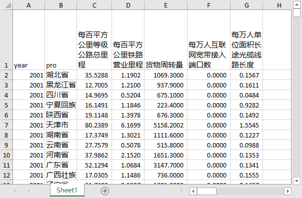 year pro 每百平方公里等级公路总里程 每百平方公里铁路营业里程 货物周转量 每万人互联网宽带接入端口数 每万人单位面积长途光缆线路长度
