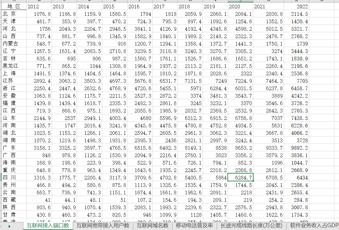 2、指标:地区、year、互联网接入端口数、互联网宽带接入用户数、互联网域名数、移动电话普及率、长途光缆线路长度(万公里)、软件业务收入占GDP比重、电信业务总量占GDP比重、电子商务交易活动企业比例、企业电子商务占GDP比重2、企业每百人使用计算机数、每百家企业拥有网站数、快递业务量、数字普惠金融指数、规模以上工业企业R&D人员折合全时当量(人年)、规模以上工业企业R&D经费(万元)、规模以上工业企业R&D项目(课题)数(项)(只到2021年)、技术合同成交总额(万元)、专利申请授权数(件)