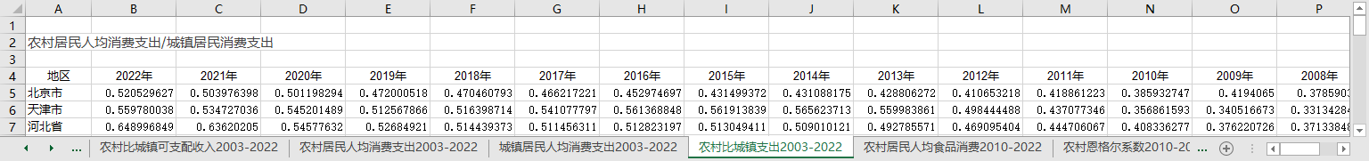 农村居民与城镇居民人均消费支出之比 农村居民人均消费支出/城镇人均居民消费支出