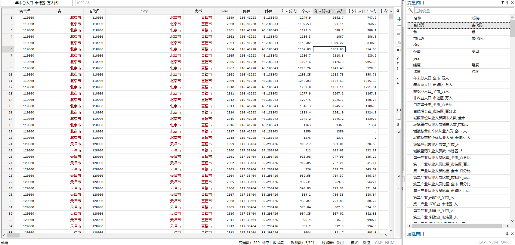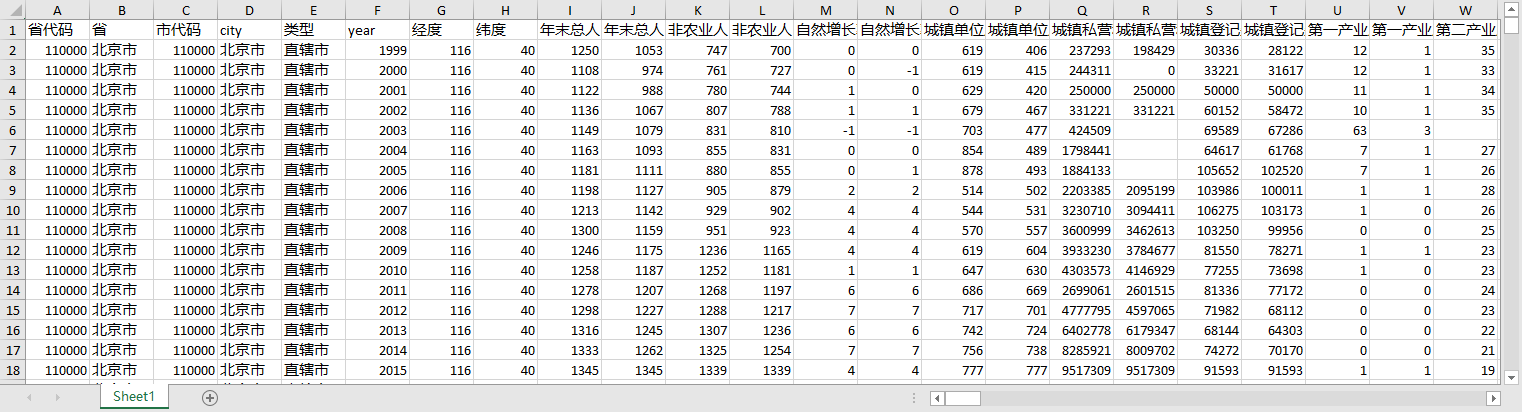 省代码 省 市代码 city 类型 year 经度 纬度 年末总人口_全市_万人 年末总人口_市辖区_万人 非农业人口_全市_万人 非农业人口_市辖区_万人 自然增长率_全市_百分比 自然增长率_市辖区_百分比 城镇单位从业人员期末人数_全市_万人 城镇单位从业人员期末人数_市辖区_万人 城镇私营和个体从业人员_全市_人 城镇私营和个体从业人员_市辖区_人 城镇登记失业人员数_全市_人 城镇登记失业人员数_市辖区_人 第一产业从业人员比重_全市_百分比 第一产业从业人员比重_市辖区_百分比 第二产业从业人员比重_全市_百分比 第二产业从业人员比重_市辖区_百分比 第三产业从业人员比重_全市_百分比 第三产业从业人员比重_市辖区_百分比 第二产业_采矿业_全市_人 第二产业_采矿业_市辖区_人 第二产业_制造业_全市_人 第二产业_制造业_市辖区_人 第二产业_电力热力燃气及水生产和供应业_全市_人 第二产业_电力热力燃气及水生产和供应业_市辖区_人 第二产业_建筑业_全市_人 第二产业_建筑业_市辖区_人 第三产业_批发和零售业_全市_人 第三产业_批发和零售业_市辖区_人 第三产业_交通运输仓储和邮政业_全市_人 第三产业_交通运输仓储和邮政业_市辖区_人 第三产业_住宿和餐饮业_全市_人 第三产业_住宿和餐饮业_市辖区_人 第三产业_信息传输计算机服务和软件业_全市_人 第三产业_信息传输计算机服务和软件业_市辖区_人 第三产业_金融业_全市_人 第三产业_金融业_市辖区_人 第三产业_房地产业_全市_人 第三产业_房地产业_市辖区_人 第三产业_租赁和商务服务业_全市_人 第三产业_租赁和商务服务业_市辖区_人 科研综合技术服务业从业人员数_全市_人 科研综合技术服务业从业人员数_市辖区_人 第三产业_水利环境和公共设施管理业_全市_人 第三产业_水利环境和公共设施管理业_市辖区_人 第三产业_居民服务、修理和其他服务业_全市_人 第三产业_居民服务、修理和其他服务业_市辖区_人 第三产业_教育_全市_人 第三产业_教育_市辖区_人 第三产业_卫生和社会工作_全市_人 第三产业_卫生和社会工作_市辖区_人 第三产业_文化体育和娱乐业_全市_人 第三产业_文化体育和娱乐业_市辖区_人 第三产业_公共管理社会保障和社会组织_全市_人 第三产业_公共管理社会保障和社会组织_市辖区_人 年末实有耕地面积_全市_千公顷 人均耕地面积_全市_亩每人 行政区域土地面积_全市_平方公里 行政区域土地面积_市辖区_平方公里 行政区域土地面积_建成区_平方公里 人口密度_全市_人每平方公里 人口密度_市辖区_人每平方公里 城市建设用地面积_市辖区_平方公里 城市建设用地占市辖区面积比重_百分比 地区生产总值_当年价格_全市_万元 地区生产总值_当年价格_市辖区_万元 人均地区生产总值_全市_元 人均地区生产总值_市辖区_元 地区生产总值增长率_全市_百分比 地区生产总值增长率_市辖区_百分比 第一产业占GDP的比重_全市_百分比 第一产业占GDP的比重_市辖区_百分比 第二产业占GDP的比重_全市_百分比 第二产业占GDP的比重_市辖区_百分比 第三产业占GDP的比重_全市_百分比 第三产业占GDP的比重_市辖区_百分比 蔬菜_全市_吨 水果_全市_吨 肉类_全市_吨 奶类_全市_吨 水产品_全市_吨 人均蔬菜产量_全市_千克 人均肉类产量_全市_千克 人均水果产量_全市_千克 人均牛羊奶产量_全市_千克 人均水产品产量_全市_千克 国有及年销售收入500万以上非国有工业企业数_全市_个 国有及年销售收入500万以上非国有工业企业数_市辖区_个 国有及年销售收入500万以上非国有工企工业总产值_全市_万元 国有及年销售收入500万以上非国有工企工业总产值_市辖区_万元 国有及年销售收入500万以上非国有工企年均从业人数_全市_人 国有及年销售收入500万以上非国有工企年均从业人数_市辖区_人 规模以上工业企业数_全市_个 规模以上工业企业数_市辖区_个 规模以上内资企业数_全市_个 规模以上内资企业数_市辖区_个 规模以上港澳台商投资企业_全市_个 规模以上港澳台商投资企业_市辖区_个 规模以上外商投资企业_全市_个 规模以上外商投资企业_市辖区_个 规模以上工业总产值_全市_万元 规模以上工业总产值_市辖区_万元 规模以上内资企业工业总产值_全市_万元 规模以上内资企业工业总产值_市辖区_万元 规模以上港澳台投资工业企业工业总产值_全市_万元 规模以上港澳台投资工业企业工业总产值_市辖区_万元 规模以上外商投资工业企业工业总产值_全市_万元 规模以上外商投资工业企业工业总产值_市辖区_万元 规模以上工业企业本年应交增值税_全市_万元 规模以上工业企业本年应交增值税_市辖区_万元 利税总额_全市_万元 利税总额_市辖区_万元 固定资产净值年平均余额_全市_万元 固定资产净值年平均余额_市辖区_万元 固定资产投资总额_全市_万元 固定资产投资总额_市辖区_万元 房地产开发投资完成额_全市_万元 房地产开发投资完成额_市辖区_万元 房地产开发投资完成额_住宅_全市_万元 房地产开发投资完成额_住宅_市辖区_万元 社会消费品零售额_全市_万元 社会消费品零售额_市辖区_万元 规模以上批发零售贸易企业数_全市_个 规模以上批发零售贸易企业数_市辖区_个 外商实际投资额_全市_万美元 外商实际投资额_市辖区_万美元 外商协议投资额_全市_万美元 外商协议投资额_