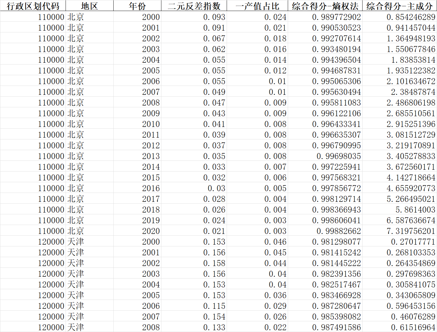 数据说明:参照钞小静等(2011)的文章,利用熵权法和主成分分析法进行“城乡二元结构”测算,原始数据及测算结果一并附上