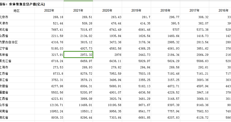 1996-2022年农林牧渔业总产值(亿元)、1996-2022年农业总产值(亿元)、1996-2022年林业总产值(亿元)、1996-2022年牧业总产值(亿元)、1996-2022年渔业总产值(亿元)、1997-2021年各省农业总产值指数(上年=100)、1997-2021年各省林业总产值指数(上年=100)、1997-2021年各省牧业总产值指数(上年=100)、1997-2021年各省渔业总产值指数(上年=100)、1997-2022年各省农林牧渔业总产值指数(上年=100)