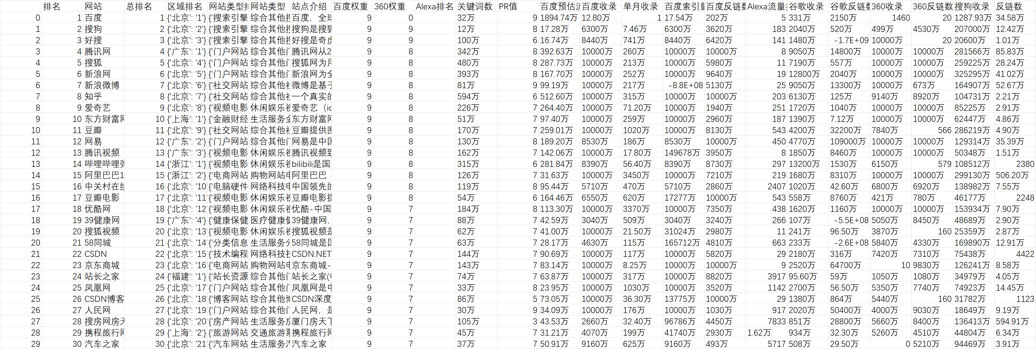 数据包括:排名 网站 总排名 区域排名 网站类型排名 网站类型 站点介绍 百度权重 360权重 Alexa排名 关键词数 PR值 百度预估流量 百度收录 单月收录 百度索引量 百度反链数 Alexa流量排名 谷歌收录 谷歌反链数 360收录 360反链数 搜狗收录 反链数