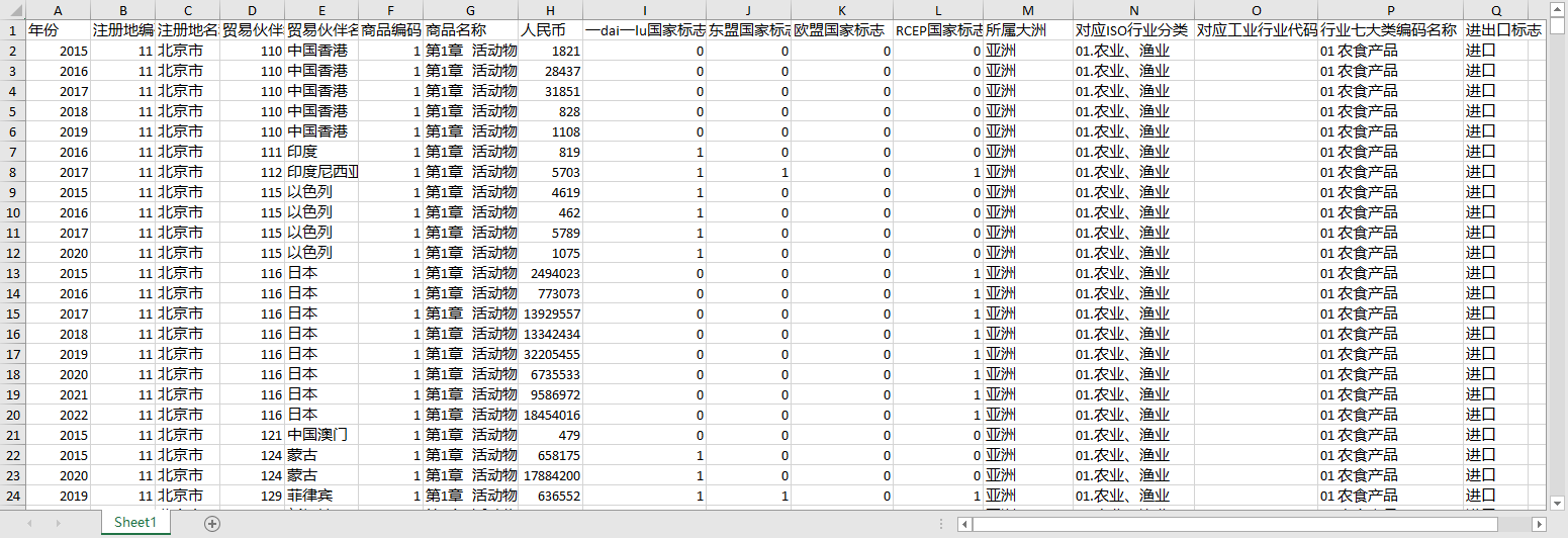 年份 注册地编码 注册地名称 贸易伙伴编码 贸易伙伴名称 商品编码 商品名称 人民币 一dai一lu国家标志 东盟国家标志 欧盟国家标志 RCEP国家标志 所属大洲 对应ISO行业分类 对应工业行业代码名称 行业七大类编码名称 进出口标志