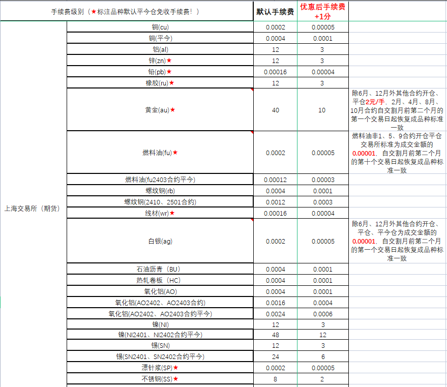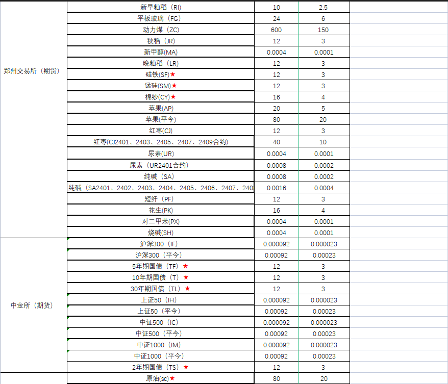 期货各品种手续费一览表!