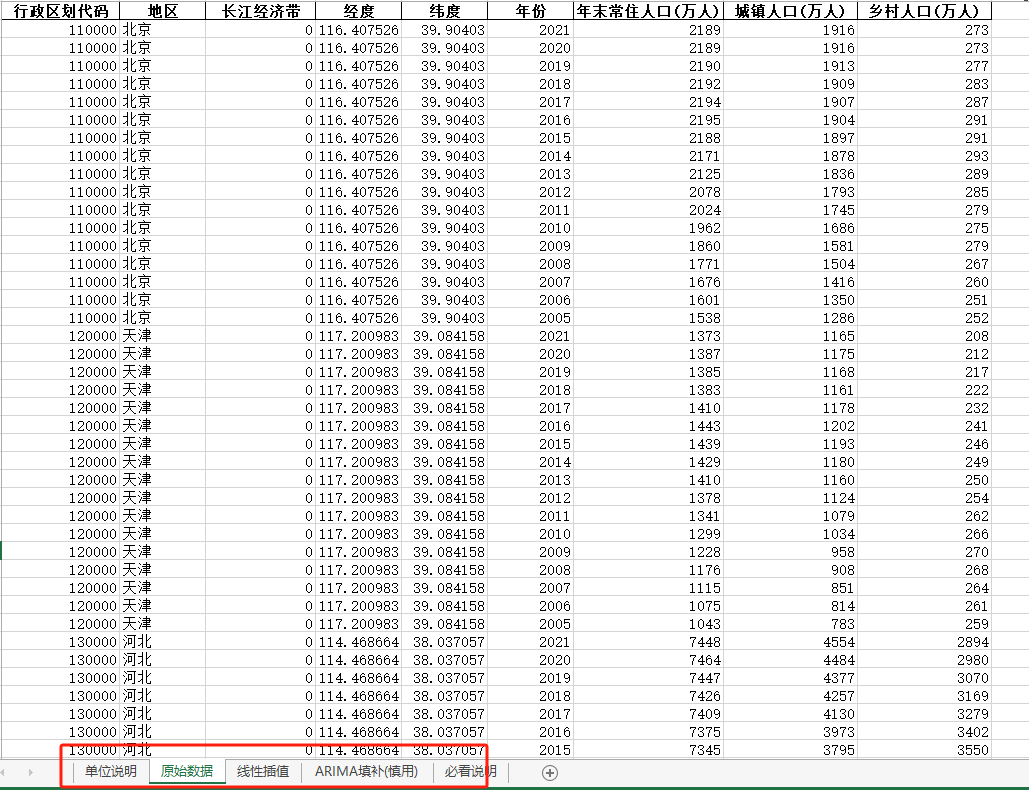 2005-2021年全国31省年末常住人口乡村人口城镇人口ARIMA填补无缺失