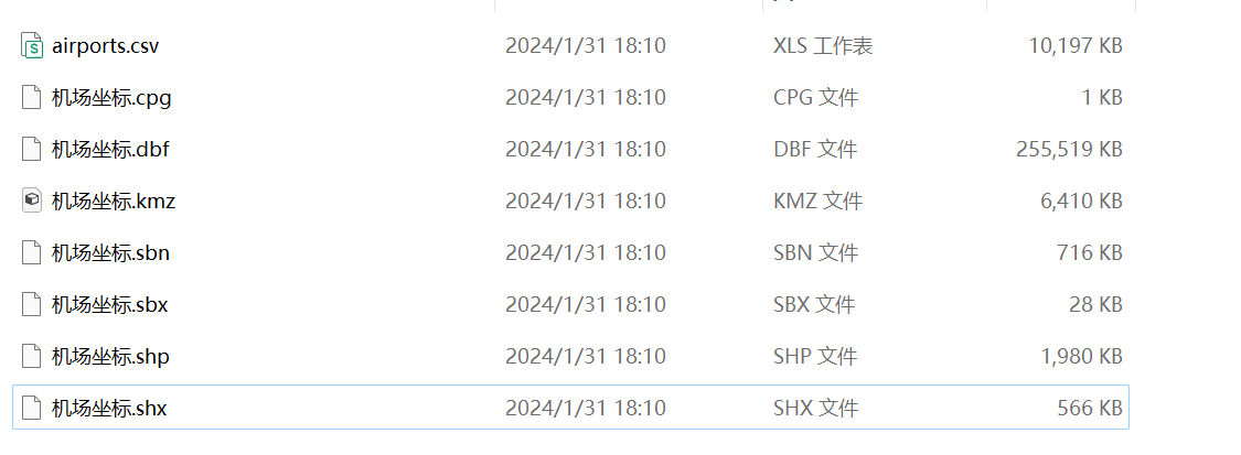 指标说明:全球机场坐标数据,包含CSV格式、shpfile格式、kml格式属性字段包括机场类型、经纬度,高程,所在国家省市区域,机场名称.