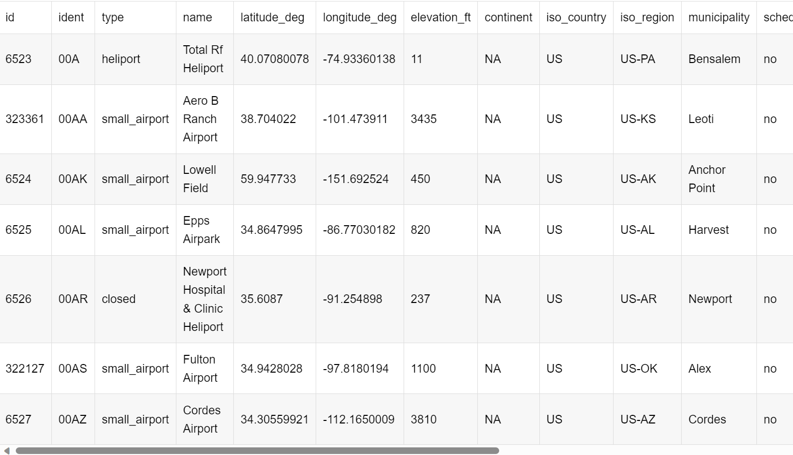 id ident type name latitude_deg longitude_deg elevation_ft continent iso_country iso_region municipality scheduled_service gps_code iata_code local_code home_link wikipedia_link keywords
