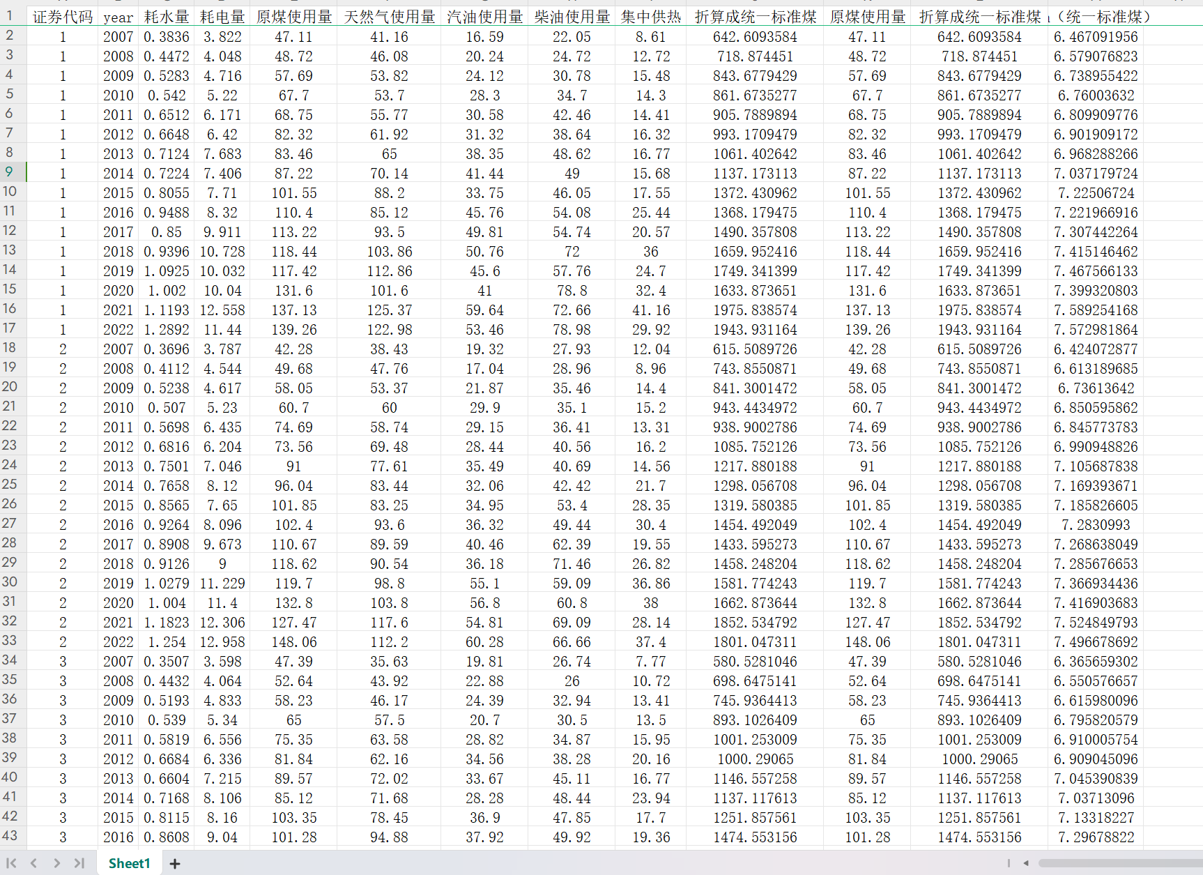 通过权威数据来源搜集上市公司能源消耗的数据并进行分类整理,同时借鉴权威文献来计算对应的能源消耗综合指数。