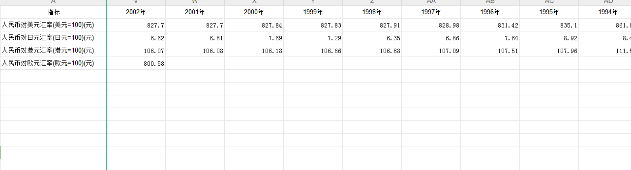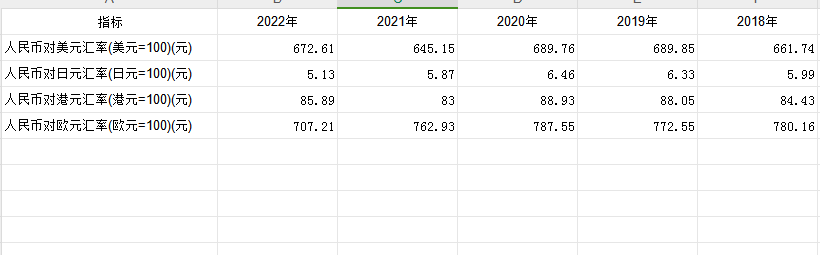 2、指标:人民币对美元汇率(美元=100)(元)、人民币对日元汇率(日元=100)(元)、人民币对港元汇率(港元=100)(元)、人民币对欧元汇率(欧元=100)(元)