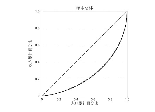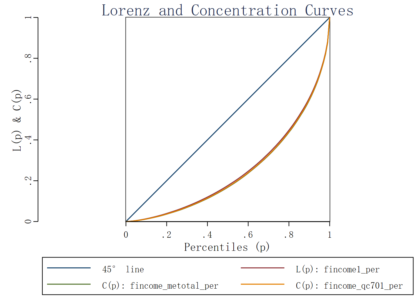 clorenz fincome1_per fincome_metotal_per fincome_qc701_per, rank(fincome1_per) min(0) max(1) title("样本总体") aspectratio(1) plotregion(margin(zero)) legend(off) xtitle("人口累计百分比") ytitle("收入累计百分比") scheme(s1mono) lpattern(longdash dash dash_dot solid) lcolor(black black black black) ylabel(,grid gstyle(dot))    //fincome1_per fincome_metotal_per fincome_qc701_per分别是需要画洛伦兹曲线和集中曲线的变量;rank(fincome1_per)指的是画曲线时样本的排列顺序按变量fincome1_per从低到高的顺序排列;min(0) max(1)指基尼系数和集中指数取值方位,亦即y轴数值范围;title("样本总体")是重命名图的标题;aspectratio(1)表示调整为正方形;plotregion(margin(zero))表示将y轴与x轴的0值位置重合;legend(off)表示去掉图例;xtitle("人口累计百分比") ytitle("收入累计百分比")分别表示给x轴和y轴重命名;scheme(s1mono)表示选择图的样式模板,选这个调整为黑白模式;lpattern(longdash dash dash_dot solid)表示设置图中各曲线的样式为长须线、虚线、虚线加点、实线,各样式对应哪条曲线按原有图例中显示的顺序一一对应;lcolor(black black black black)表示设置图中各曲线的颜色,对应曲线关系同上一个;ylabel(,grid gstyle(dot))表示y轴标签添加辅助线,辅助线样式为点。坐标轴数字样式、方向和标题大小通过图形编辑器调整