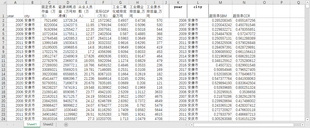 (2)最终计算结果:year city 超效率SBM 超效率CCR