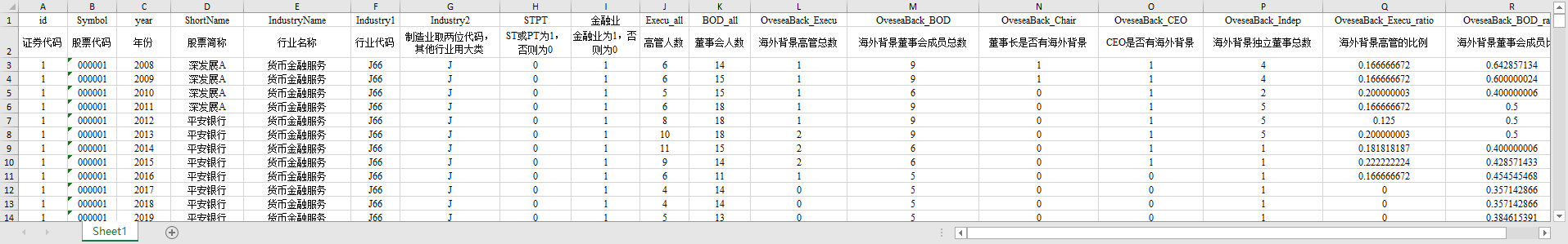 证券代码 股票代码 年份 股票简称 行业名称 行业代码 制造业取两位代码,其他行业用大类 ST或PT为1,否则为0 金融业为1,否则为0 高管人数 董事会人数 海外背景高管总数 海外背景董事会成员总数 董事长是否有海外背景 CEO是否有海外背景 海外背景独立董事总数 海外背景高管的比例 海外背景董事会成员比例