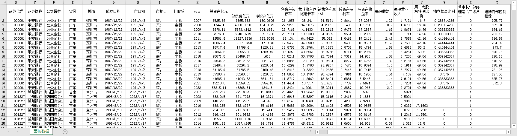 证券代码 证券简称 公司属性 省份 城市 成立日期 上市日期 上市地点 上市板 year 总资产亿元 总负债亿元 净资产亿元 净资产负债率 营业收入同比增长率 销售净利率(%) 总资产净利率 净资产收益率 每股收益 每股营业收入 第一大股东持股比例 独立董事比例 董事长与总经理是否二职合一 迪博内部控制指数