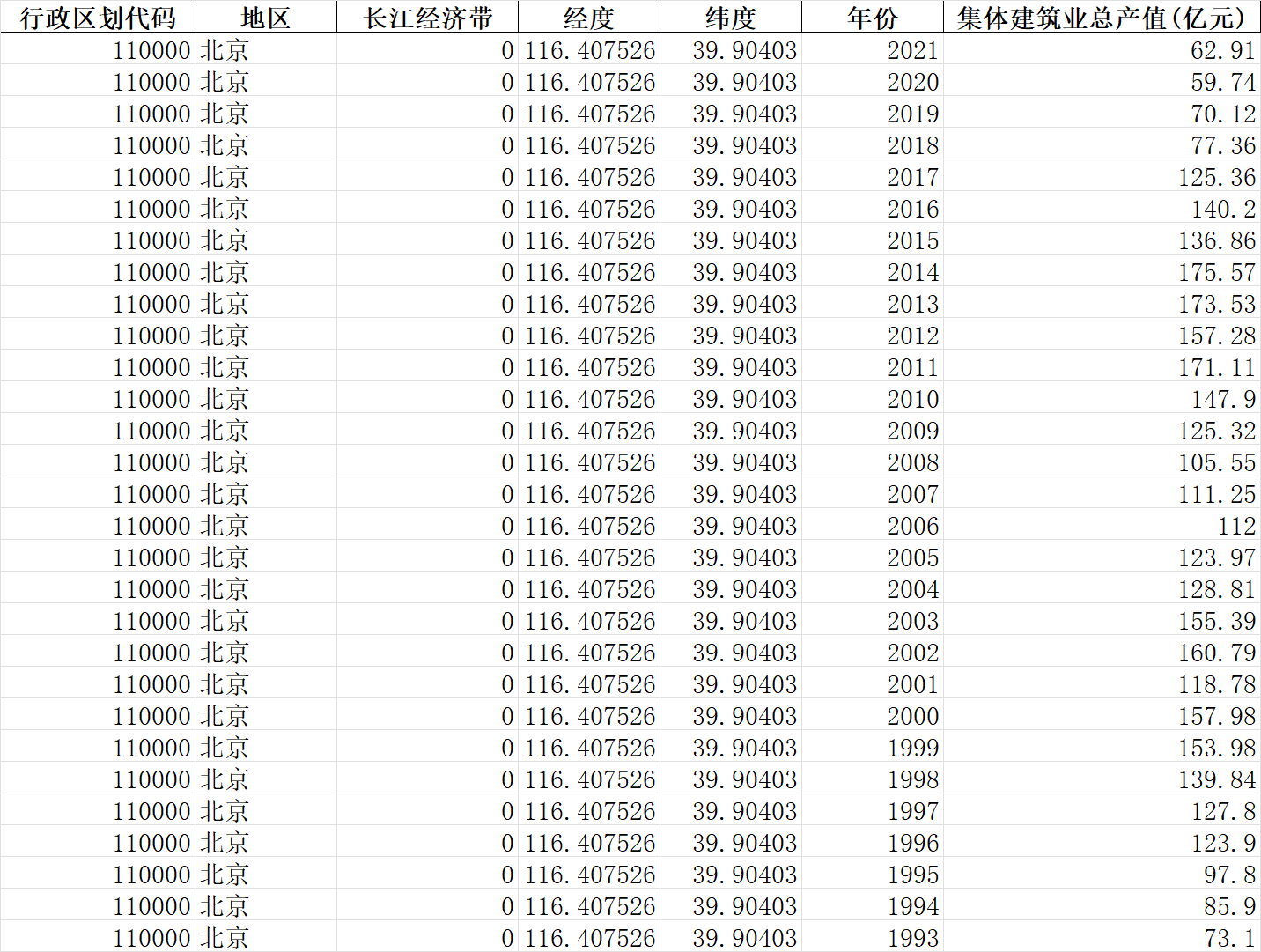 数据名称:各省份建筑业发展状况集体建筑业总产值91-21年数据