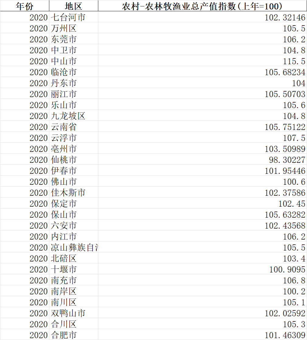 数据名称:地级市农村第一产业发展产值指数数据1999-2020年农林牧渔业总产值指数