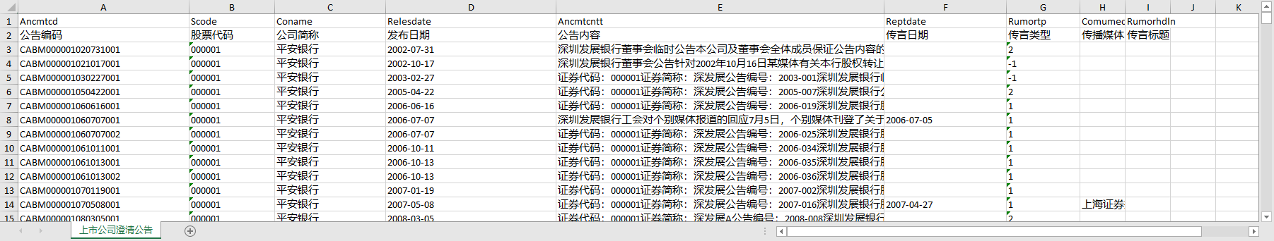 Ancmtcd[公告编码]-每份澄清公告的唯一编码,若编码重复则为同一份公告,后续字段数据内容则对同一份公告进行分行处理