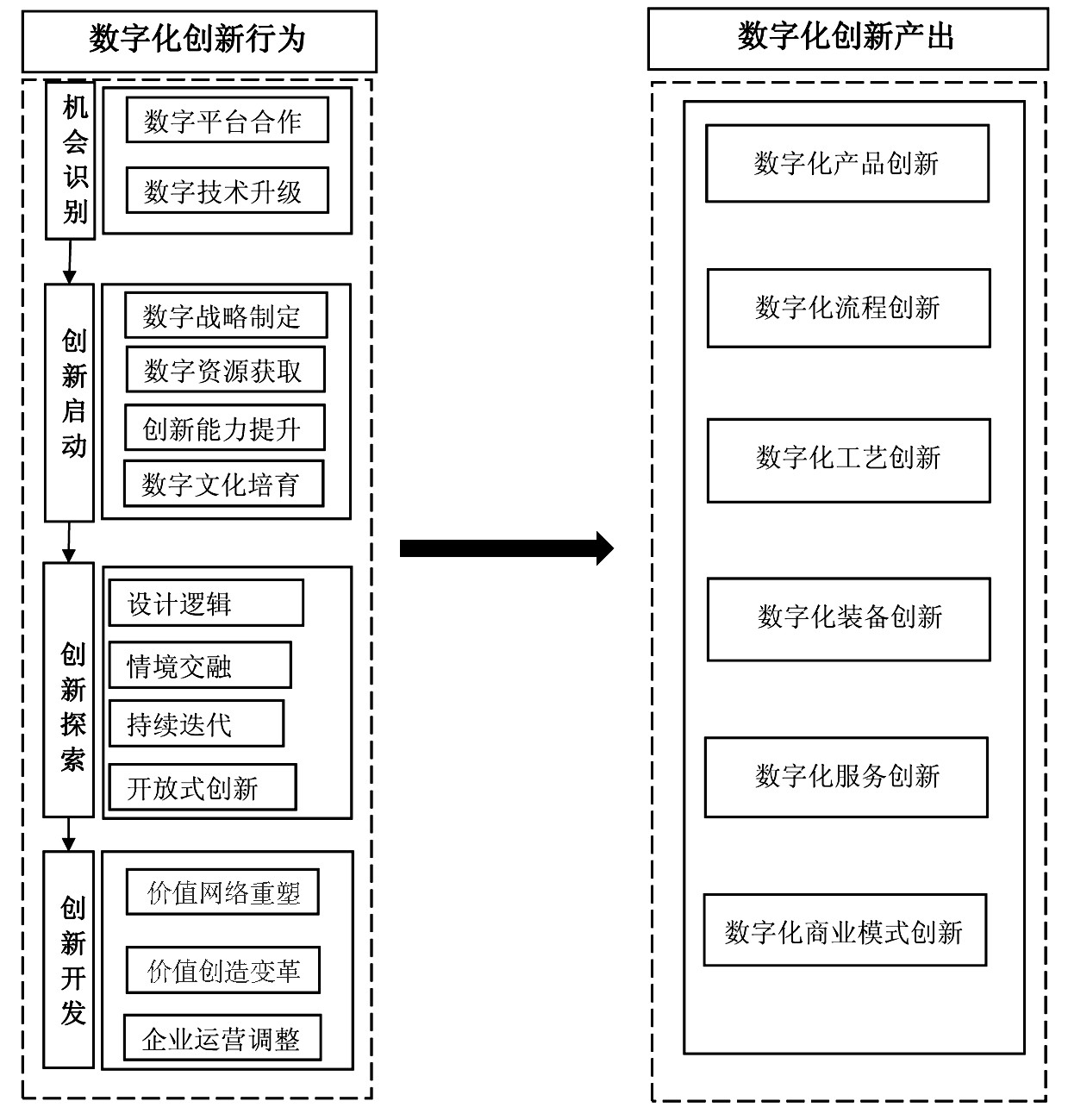 基于“行为-产出”综合视角,企业数字化创新是指运用数字化技术、工具和方法,通过对数字化资源和能力进行重构整合,在与内外部环境相互作用的过程中,创造出新的产品、服务、流程、工艺和商业模式。其中,机会识别、创新启动、创新探索、创新利用是制造企业实施数字化创新的关键行为。数字化产品、服务、流程、商业模式创新是数字化创新产出的表现形式,企业数字化创新概念框架如图2所示。可以发现,数字化创新是一个多维度、多要素、多指标的概念。事实上,当前关于企业数字化创新的实证研究鲜少,因此有效衡量企业数字化创新是本研究需要突破的重难点之一,原因在于数字化创新的有效测度直接关系到回归结果的可靠程度。而现有多数文献仍然以问卷调查、量表开发和单一指标为主,设计问卷和量表测度企业数字化创新程度,由于样本设置的有限性,不具有普适性,而单一指标缺乏合理性。因此本文采用文本分析法与词频统计测度企业数字化创新,对企业年度报告进行文本分析,并对数字化创新关键词进行词频统计,相比问卷调查和单一指标法,更具有科学性和合理性。原因在于,其一,企业数字化创新作为企业的重大发展战略,企业年度报告可以展现出企业的数字化创新战略特征和未来展望,体现出企业的数字化创新发展路径。其二,词频统计是文本挖掘中的重要技术,该技术起源于文献计量学,是对文本内容中特定关键词或短语出现的频数进行统计分析的过程,是一种客观的统计方法。因此通过文本挖掘技术,用企业年度报告中数字化创新相关的关键词出现的频数,对企业数字化创新进行量化分析,可以较为全面有效地衡量企业数字化创新。