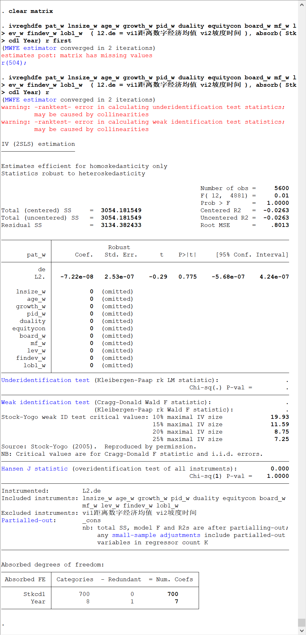 9. **检查`ivreghdfe`命令的具体用法**:确保你正确地设置了工具变量、内生性和吸收固定效应等选项,错误的模型设定也可能导致上述问题出现。