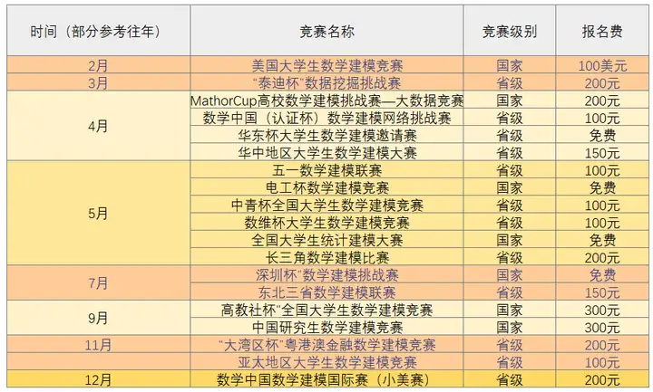 美赛已过,好多小伙伴表示已经错过,不清楚什么时候报名,什么时候准备,其实每年数学建模比赛有很多个,各大比赛的级别、报名时间、参赛对象等要求什么呢?小编从竞赛说明、竞赛级别、是否允许跨校、报名费用、参赛时间等方面详细汇总了19个建模比赛,还在担心自己错过机会吗?码住这篇,一定要看到最后!