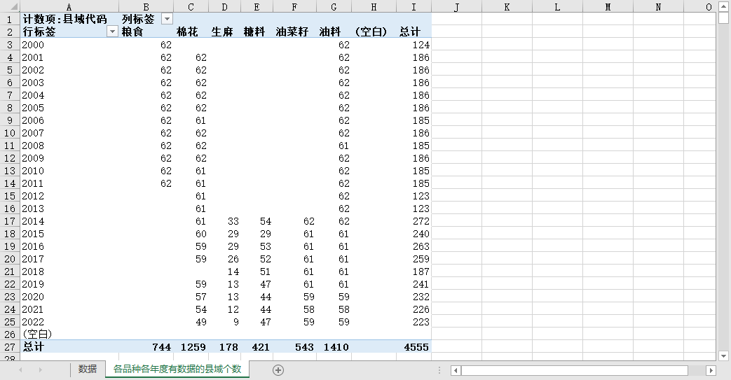 农产品的各品种、在各年度有统计数据的本省县域个数如下(详见图片内容):