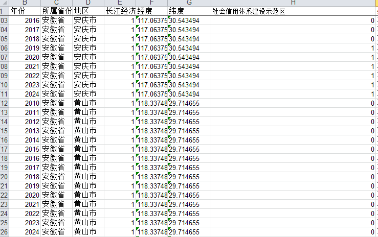 具体指标为:年份 所属省份 地区 长江经济带 经度 纬度 社会信用体系建设示范区