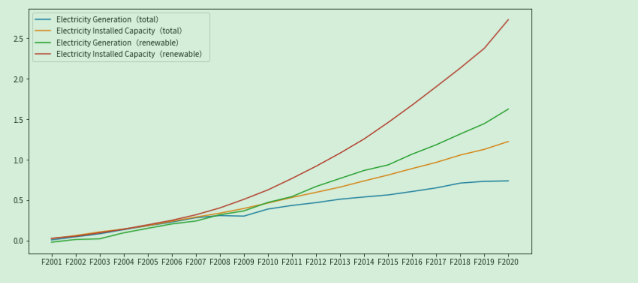 装机容量代表总的发电能力,发电量代表实际耗能排放量,通过分析全球装机容量和发电量的数值关系探究全球已开发的能源资源的利用效率。根据装机容量和发电量相比 2000 年的增长率全球发电量与装机容量几乎每年都在上升,且 2008 年后装机容量的增长率明显高于发电量的增长率,这一关系在可再生能源的装机容量与发电量上更为明显。装机容量增长率高于发电量增率,电能的实际生产能力超过了市场需求、超过了正常期望水平的状态,全球能源存在一定的产能过剩问题,这将不利于能源结构的切实转型与经济社会的良性发展。各国需相应的开展淘汰落后产能、严控新增产能规模等工作,在节能减排的同时提高产能利用率,促进经济、环境与社会的协调发展。可再生能源的增长率大大高于总体水平,且增长率呈逐年升高趋势,可以说明全球在发展清洁能源上已有切实行动,但可再生能源总装机占比仍低于非可再生能源,全球范围内要实现能源转型,还需继续推进清洁能源大规模开发利用,并不断降低清洁能源开发利用成本。