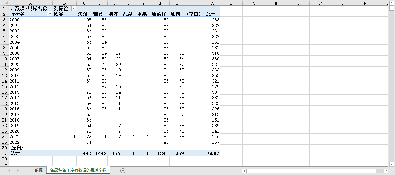 农产品的各品种、在各年度有统计数据的本省县域个数如下(详见图片内容):