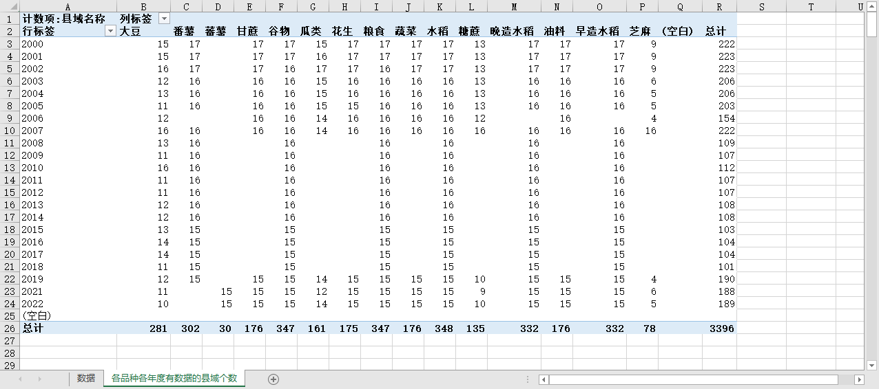 农产品的各品种、在各年度有统计数据的本省县域个数如下(详见图片内容):