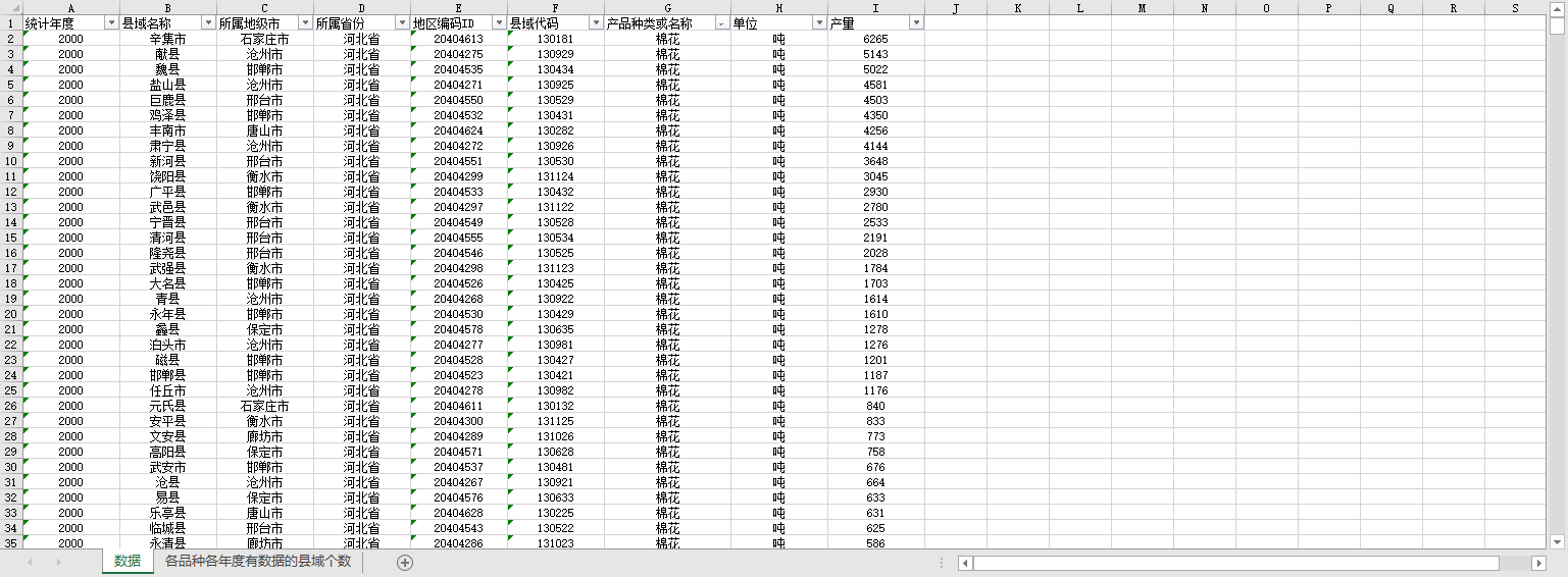 统计年度 县域名称 所属地级市 所属省份 地区编码ID 县域代码 产品种类或名称 单位 产量