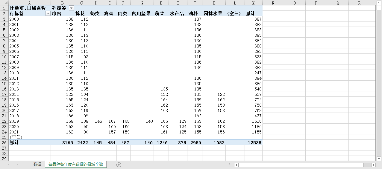 农产品的各品种、在各年度有统计数据的本省县域个数如下(详见图片内容):