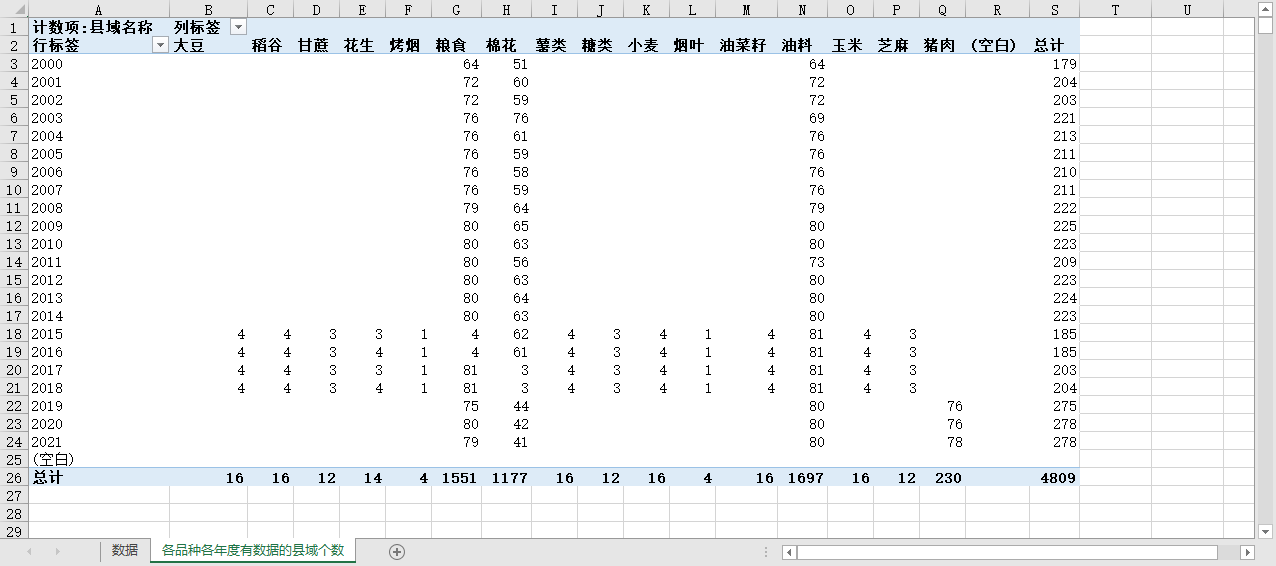 农产品的各品种、在各年度有统计数据的本省县域个数如下(详见图片内容):