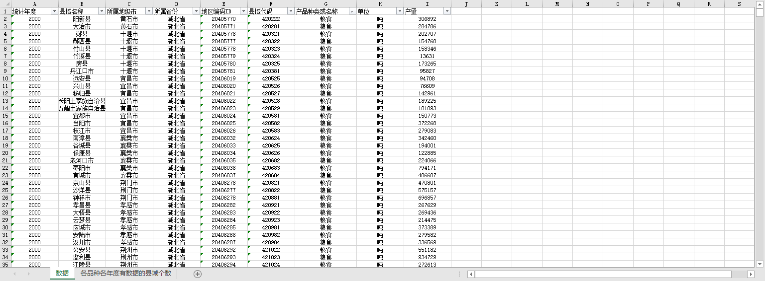 统计年度 县域名称 所属地级市 所属省份 地区编码ID 县域代码 产品种类或名称 单位 产量