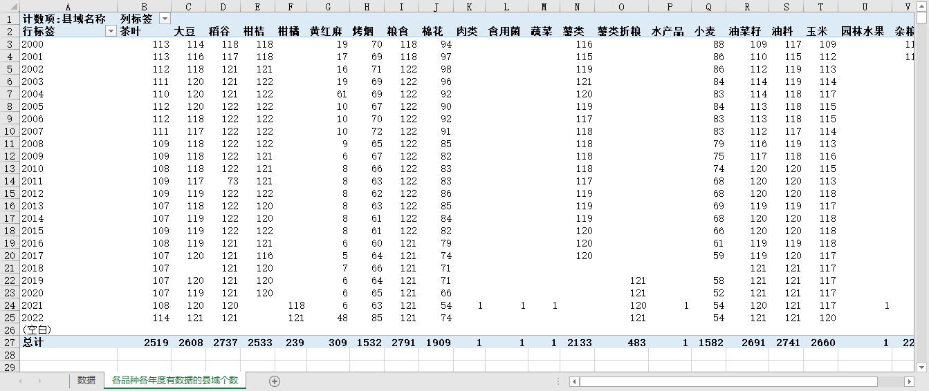 农产品的各品种、在各年度有统计数据的本省县域个数如下(详见图片内容):