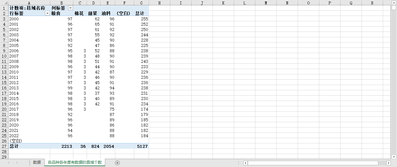 农产品的各品种、在各年度有统计数据的本省县域个数如下(详见图片内容):