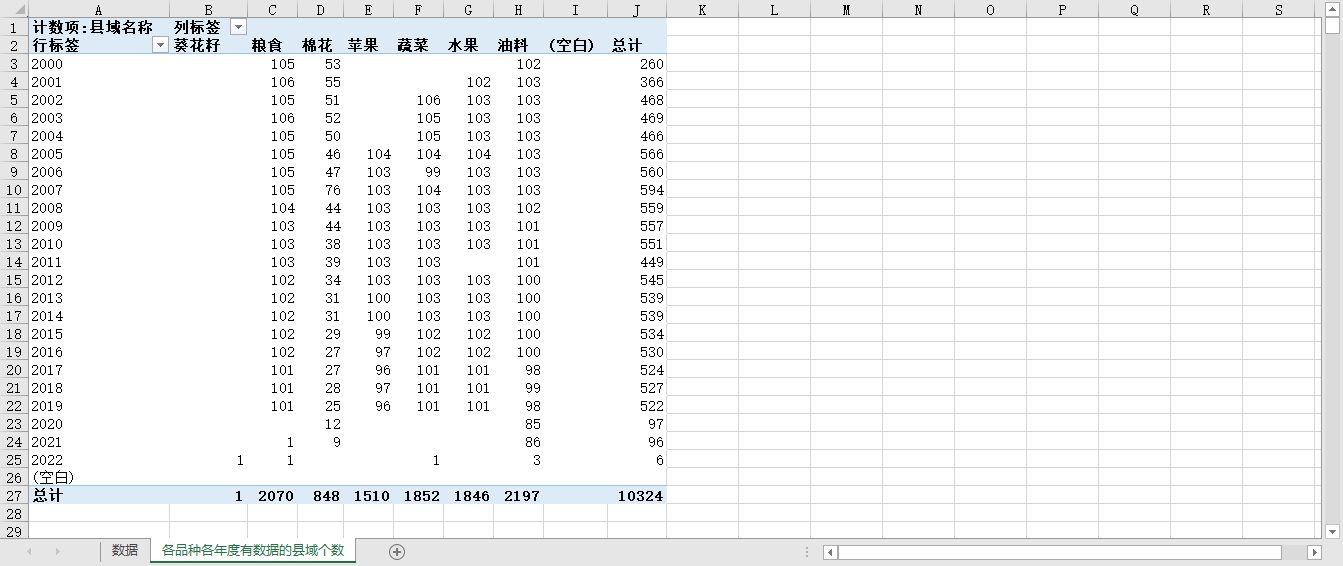 农产品的各品种、在各年度有统计数据的本省县域个数如下(详见图片内容):