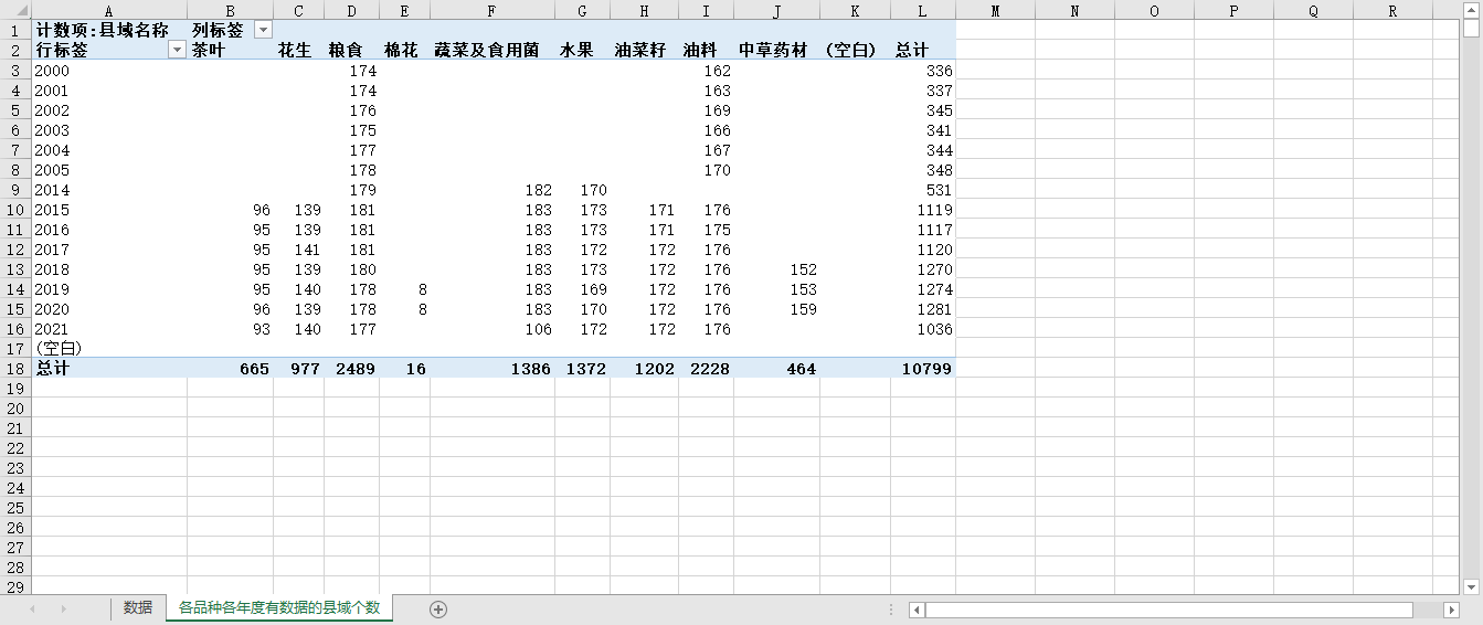 农产品的各品种、在各年度有统计数据的本省县域个数如下(详见图片内容):