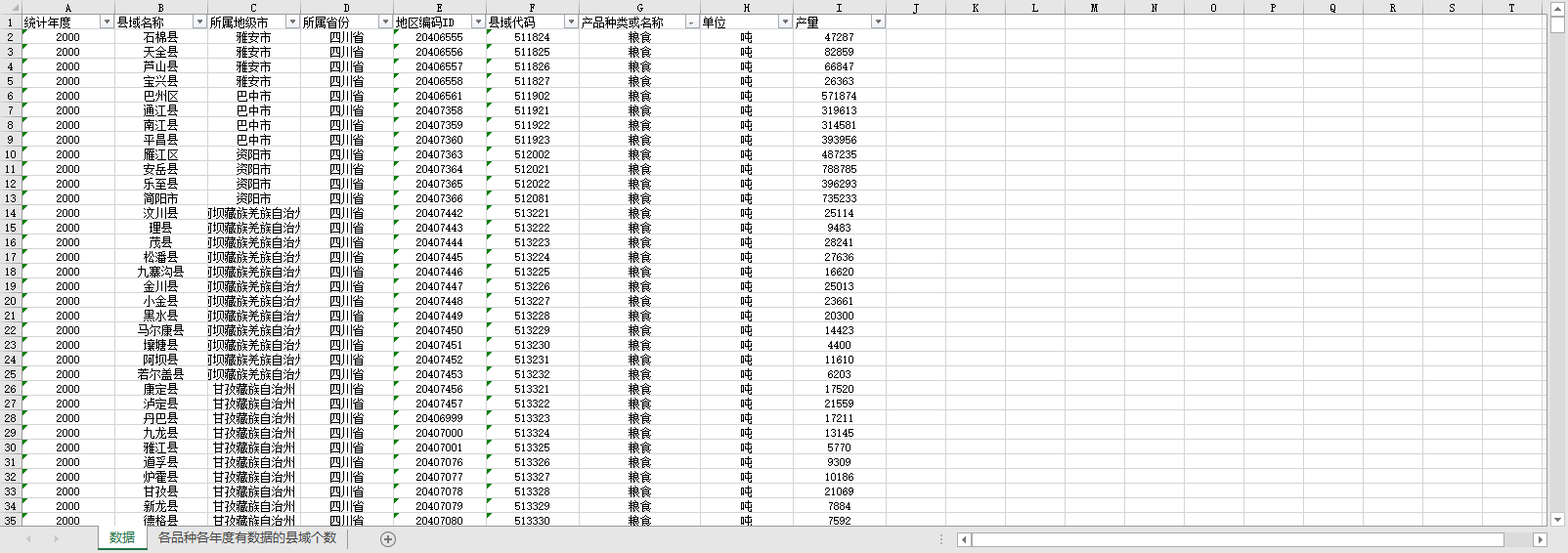 统计年度 县域名称 所属地级市 所属省份 地区编码ID 县域代码 产品种类或名称 单位 产量