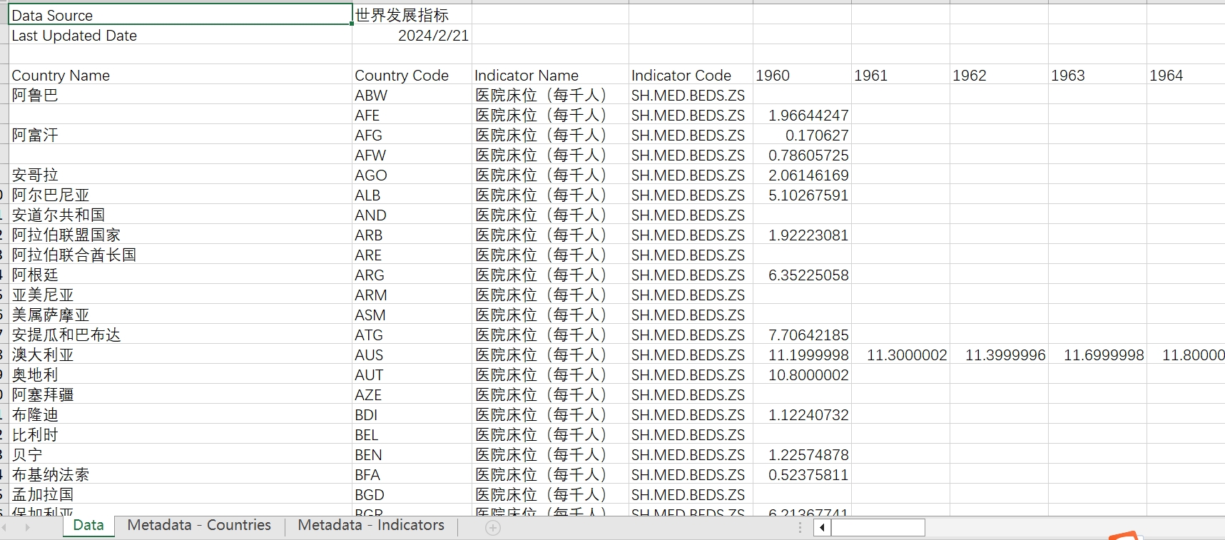 [WB]世界各国医院床位(每千人)指标1960-2021[WB]世界各国医院床位(每千人)指标1960-2021
