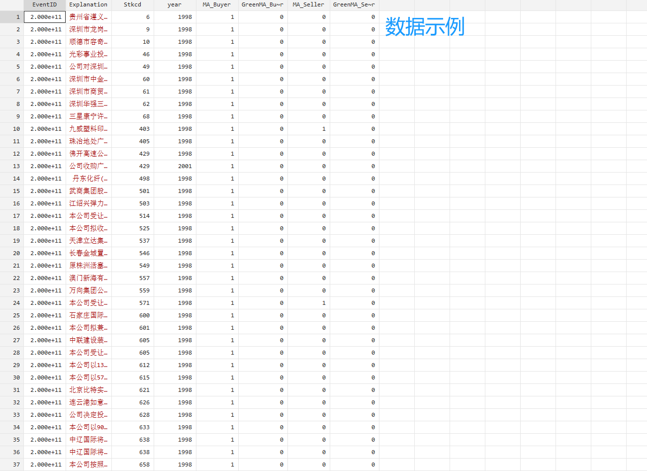 [4]判定方法:采用文本分析法对1997至2024年买卖方为上市公司的并购事件进行分析,将交易标的、交易概述等包括环保、节能、绿色、低碳等信息的认定为绿色并购。