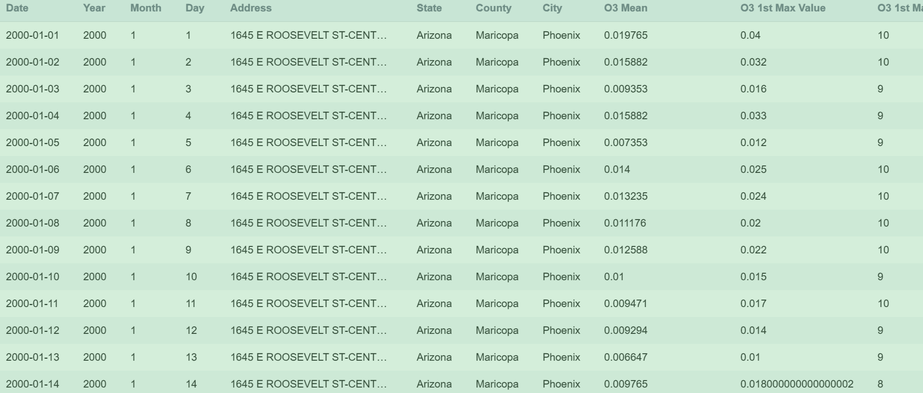 包含有关四种主要气体污染物的信息:一氧化碳、二氧化氮、地面臭氧和二氧化硫。